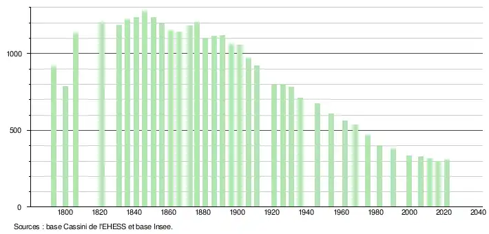 L'évolution du nombre d'habitants est connue à travers les recensements de la population effectués dans la commune depuis 1793. Pour les communes de moins de 10 000 habitants, une enquête de recensement portant sur toute la population est réalisée tous les cinq ans, les populations légales des années intermédiaires étant quant à elles estimées par interpolation ou extrapolation[26]. Pour la commune, le premier recensement exhaustif entrant dans le cadre du nouveau dispositif a été réalisé en 2006[27].
