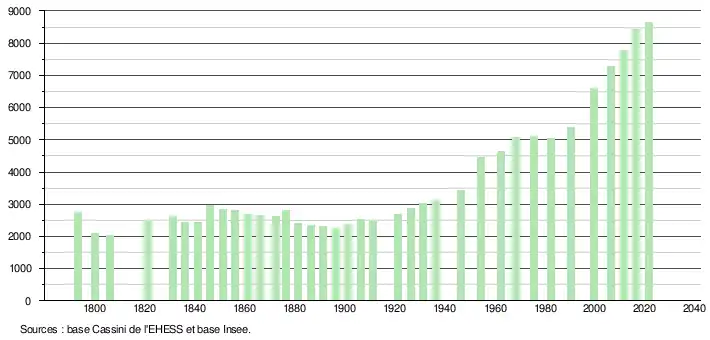 L'évolution du nombre d'habitants est connue à travers les recensements de la population effectués dans la commune depuis 1793. Pour les communes de moins de 10 000 habitants, une enquête de recensement portant sur toute la population est réalisée tous les cinq ans, les populations légales des années intermédiaires étant quant à elles estimées par interpolation ou extrapolation[29]. Pour la commune, le premier recensement exhaustif entrant dans le cadre du nouveau dispositif a été réalisé en 2006[30].