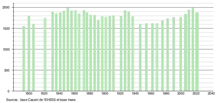 L'évolution du nombre d'habitants est connue à travers les recensements de la population effectués dans la commune depuis 1793. Pour les communes de moins de 10 000 habitants, une enquête de recensement portant sur toute la population est réalisée tous les cinq ans, les populations légales des années intermédiaires étant quant à elles estimées par interpolation ou extrapolation[25]. Pour la commune, le premier recensement exhaustif entrant dans le cadre du nouveau dispositif a été réalisé en 2005[26].