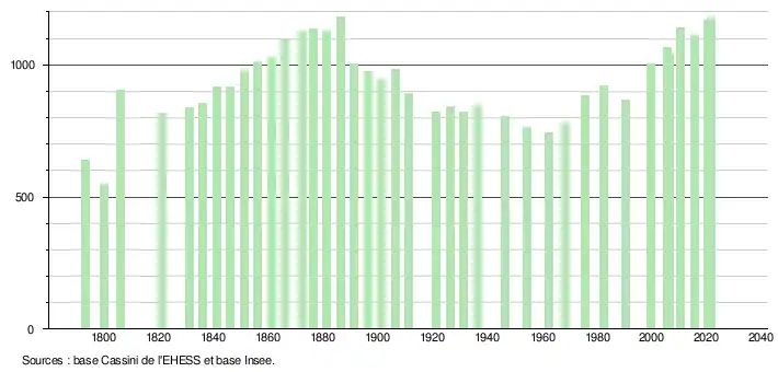 L'évolution du nombre d'habitants est connue à travers les recensements de la population effectués dans la commune depuis 1793. Pour les communes de moins de 10 000 habitants, une enquête de recensement portant sur toute la population est réalisée tous les cinq ans, les populations légales des années intermédiaires étant quant à elles estimées par interpolation ou extrapolation[46]. Pour la commune, le premier recensement exhaustif entrant dans le cadre du nouveau dispositif a été réalisé en 2005[47].