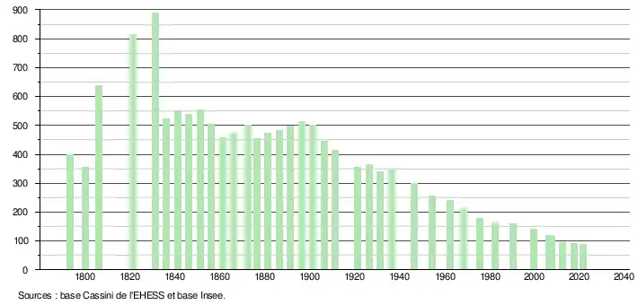 L'évolution du nombre d'habitants est connue à travers les recensements de la population effectués dans la commune depuis 1793. Pour les communes de moins de 10 000 habitants, une enquête de recensement portant sur toute la population est réalisée tous les cinq ans, les populations légales des années intermédiaires étant quant à elles estimées par interpolation ou extrapolation[18]. Pour la commune, le premier recensement exhaustif entrant dans le cadre du nouveau dispositif a été réalisé en 2007[19].