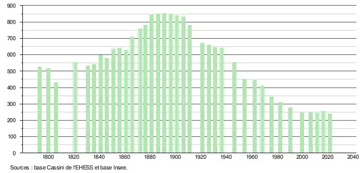 L'évolution du nombre d'habitants est connue à travers les recensements de la population effectués dans la commune depuis 1793. Pour les communes de moins de 10 000 habitants, une enquête de recensement portant sur toute la population est réalisée tous les cinq ans, les populations légales des années intermédiaires étant quant à elles estimées par interpolation ou extrapolation[28]. Pour la commune, le premier recensement exhaustif entrant dans le cadre du nouveau dispositif a été réalisé en 2006[29].