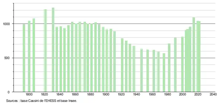 L'évolution du nombre d'habitants est connue à travers les recensements de la population effectués dans la commune depuis 1793. Pour les communes de moins de 10 000 habitants, une enquête de recensement portant sur toute la population est réalisée tous les cinq ans, les populations légales des années intermédiaires étant quant à elles estimées par interpolation ou extrapolation[17]. Pour la commune, le premier recensement exhaustif entrant dans le cadre du nouveau dispositif a été réalisé en 2004[18].