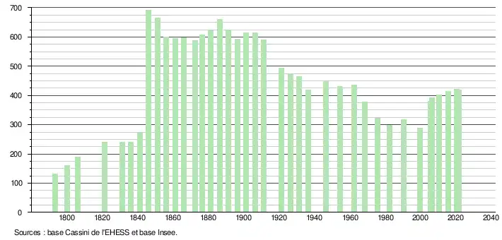 L'évolution du nombre d'habitants est connue à travers les recensements de la population effectués dans la commune depuis 1793. Pour les communes de moins de 10 000 habitants, une enquête de recensement portant sur toute la population est réalisée tous les cinq ans, les populations légales des années intermédiaires étant quant à elles estimées par interpolation ou extrapolation[18]. Pour la commune, le premier recensement exhaustif entrant dans le cadre du nouveau dispositif a été réalisé en 2005[19].