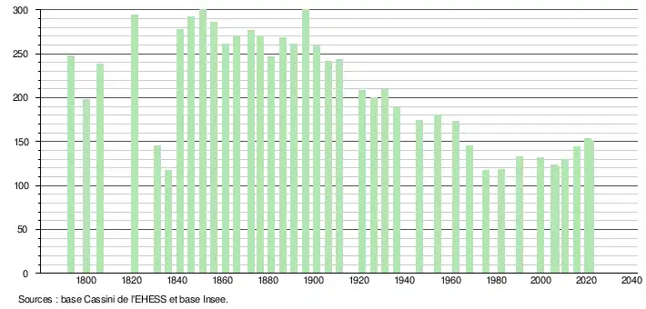 L'évolution du nombre d'habitants est connue à travers les recensements de la population effectués dans la commune depuis 1793. Pour les communes de moins de 10 000 habitants, une enquête de recensement portant sur toute la population est réalisée tous les cinq ans, les populations légales des années intermédiaires étant quant à elles estimées par interpolation ou extrapolation[18]. Pour la commune, le premier recensement exhaustif entrant dans le cadre du nouveau dispositif a été réalisé en 2005[19].