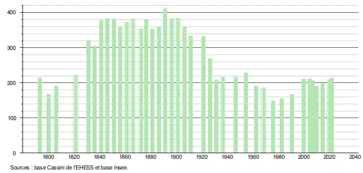L'évolution du nombre d'habitants est connue à travers les recensements de la population effectués dans la commune depuis 1793. Pour les communes de moins de 10 000 habitants, une enquête de recensement portant sur toute la population est réalisée tous les cinq ans, les populations légales des années intermédiaires étant quant à elles estimées par interpolation ou extrapolation[18]. Pour la commune, le premier recensement exhaustif entrant dans le cadre du nouveau dispositif a été réalisé en 2004[19].