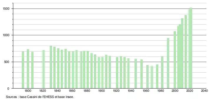 L'évolution du nombre d'habitants est connue à travers les recensements de la population effectués dans la commune depuis 1793. Pour les communes de moins de 10 000 habitants, une enquête de recensement portant sur toute la population est réalisée tous les cinq ans, les populations légales des années intermédiaires étant quant à elles estimées par interpolation ou extrapolation[19]. Pour la commune, le premier recensement exhaustif entrant dans le cadre du nouveau dispositif a été réalisé en 2004[20].