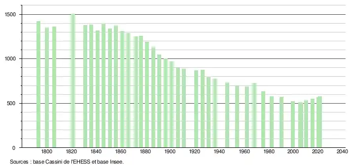 L'évolution du nombre d'habitants est connue à travers les recensements de la population effectués dans la commune depuis 1793. Pour les communes de moins de 10 000 habitants, une enquête de recensement portant sur toute la population est réalisée tous les cinq ans, les populations légales des années intermédiaires étant quant à elles estimées par interpolation ou extrapolation[22]. Pour la commune, le premier recensement exhaustif entrant dans le cadre du nouveau dispositif a été réalisé en 2005[23].