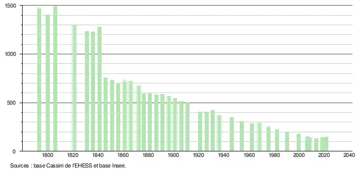 L'évolution du nombre d'habitants est connue à travers les recensements de la population effectués dans la commune depuis 1793. Pour les communes de moins de 10 000 habitants, une enquête de recensement portant sur toute la population est réalisée tous les cinq ans, les populations légales des années intermédiaires étant quant à elles estimées par interpolation ou extrapolation[14]. Pour la commune, le premier recensement exhaustif entrant dans le cadre du nouveau dispositif a été réalisé en 2008[15].