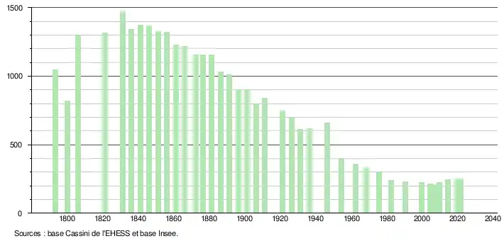 L'évolution du nombre d'habitants est connue à travers les recensements de la population effectués dans la commune depuis 1793. Pour les communes de moins de 10 000 habitants, une enquête de recensement portant sur toute la population est réalisée tous les cinq ans, les populations légales des années intermédiaires étant quant à elles estimées par interpolation ou extrapolation[14]. Pour la commune, le premier recensement exhaustif entrant dans le cadre du nouveau dispositif a été réalisé en 2004[15].