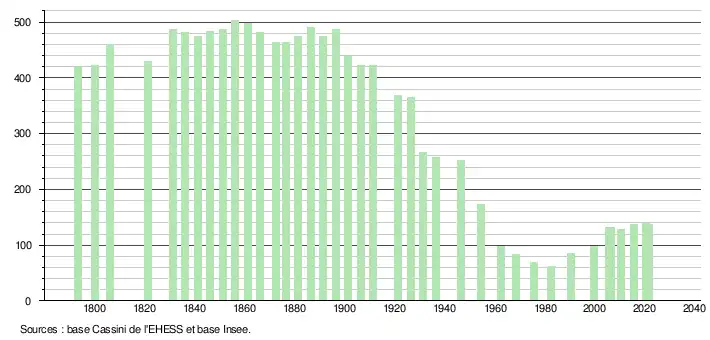 L'évolution du nombre d'habitants est connue à travers les recensements de la population effectués dans la commune depuis 1793. Pour les communes de moins de 10 000 habitants, une enquête de recensement portant sur toute la population est réalisée tous les cinq ans, les populations légales des années intermédiaires étant quant à elles estimées par interpolation ou extrapolation[16]. Pour la commune, le premier recensement exhaustif entrant dans le cadre du nouveau dispositif a été réalisé en 2005[17].