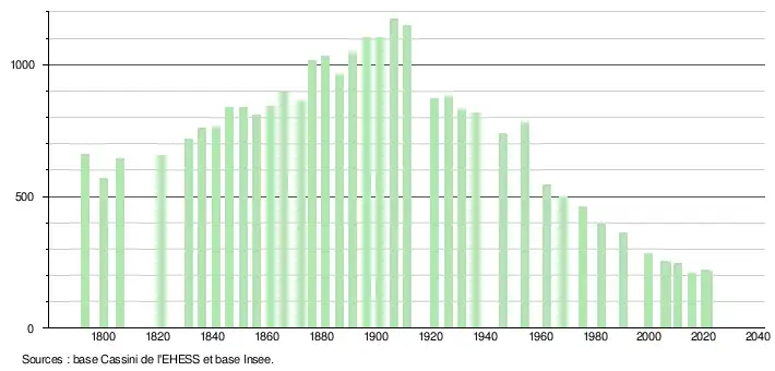 L'évolution du nombre d'habitants est connue à travers les recensements de la population effectués dans la commune depuis 1793. Pour les communes de moins de 10 000 habitants, une enquête de recensement portant sur toute la population est réalisée tous les cinq ans, les populations légales des années intermédiaires étant quant à elles estimées par interpolation ou extrapolation[20]. Pour la commune, le premier recensement exhaustif entrant dans le cadre du nouveau dispositif a été réalisé en 2005[21].