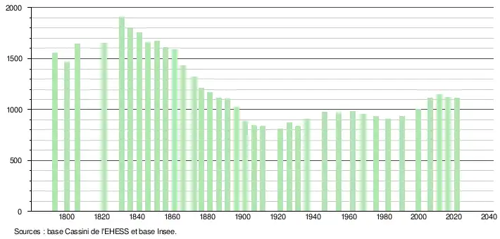 L'évolution du nombre d'habitants est connue à travers les recensements de la population effectués dans la commune depuis 1793. Pour les communes de moins de 10 000 habitants, une enquête de recensement portant sur toute la population est réalisée tous les cinq ans, les populations légales des années intermédiaires étant quant à elles estimées par interpolation ou extrapolation[19]. Pour la commune, le premier recensement exhaustif entrant dans le cadre du nouveau dispositif a été réalisé en 2006[20].