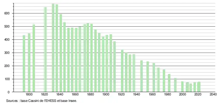 L'évolution du nombre d'habitants est connue à travers les recensements de la population effectués dans la commune depuis 1793. Pour les communes de moins de 10 000 habitants, une enquête de recensement portant sur toute la population est réalisée tous les cinq ans, les populations légales des années intermédiaires étant quant à elles estimées par interpolation ou extrapolation[16]. Pour la commune, le premier recensement exhaustif entrant dans le cadre du nouveau dispositif a été réalisé en 2005[17].