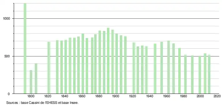 L'évolution du nombre d'habitants est connue à travers les recensements de la population effectués dans la commune depuis 1793. À partir du , les populations légales des communes sont publiées annuellement dans le cadre d'un recensement qui repose désormais sur une collecte d'information annuelle, concernant successivement tous les territoires communaux au cours d'une période de cinq ans. Pour les communes de moins de 10 000 habitants, une enquête de recensement portant sur toute la population est réalisée tous les cinq ans, les populations légales des années intermédiaires étant quant à elles estimées par interpolation ou extrapolation[4]. Pour la commune, le premier recensement exhaustif entrant dans le cadre du nouveau dispositif a été réalisé en 2005[5],[Note 1].