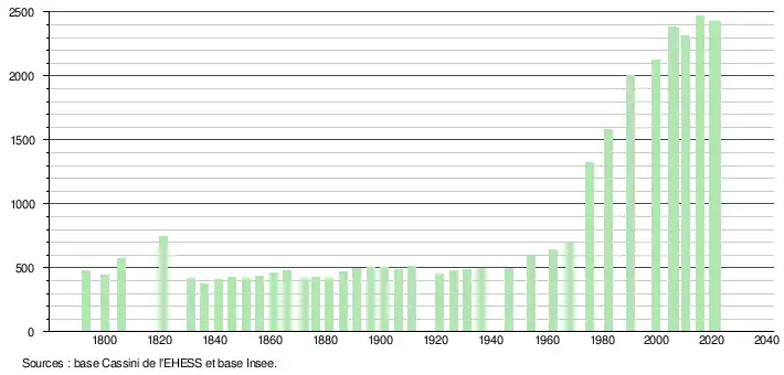 L'évolution du nombre d'habitants est connue à travers les recensements de la population effectués dans la commune depuis 1793. Pour les communes de moins de 10 000 habitants, une enquête de recensement portant sur toute la population est réalisée tous les cinq ans, les populations légales des années intermédiaires étant quant à elles estimées par interpolation ou extrapolation[20]. Pour la commune, le premier recensement exhaustif entrant dans le cadre du nouveau dispositif a été réalisé en 2005[21].
