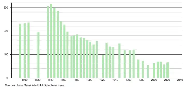 L'évolution du nombre d'habitants est connue à travers les recensements de la population effectués dans la commune depuis 1793. Pour les communes de moins de 10 000 habitants, une enquête de recensement portant sur toute la population est réalisée tous les cinq ans, les populations légales des années intermédiaires étant quant à elles estimées par interpolation ou extrapolation[26]. Pour la commune, le premier recensement exhaustif entrant dans le cadre du nouveau dispositif a été réalisé en 2005[27].