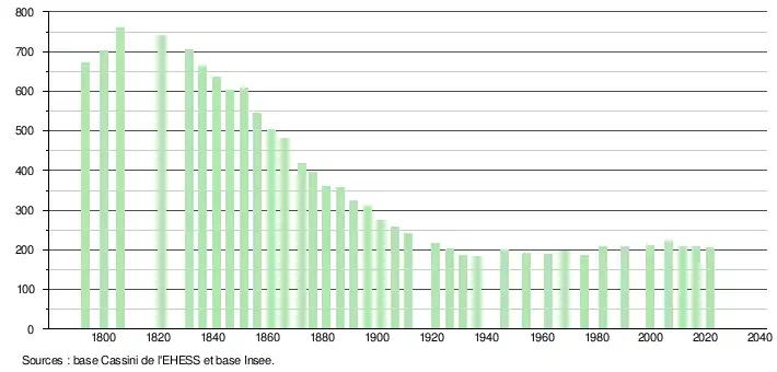 L'évolution du nombre d'habitants est connue à travers les recensements de la population effectués dans la commune depuis 1793. Pour les communes de moins de 10 000 habitants, une enquête de recensement portant sur toute la population est réalisée tous les cinq ans, les populations légales des années intermédiaires étant quant à elles estimées par interpolation ou extrapolation[24]. Pour la commune, le premier recensement exhaustif entrant dans le cadre du nouveau dispositif a été réalisé en 2006[25].