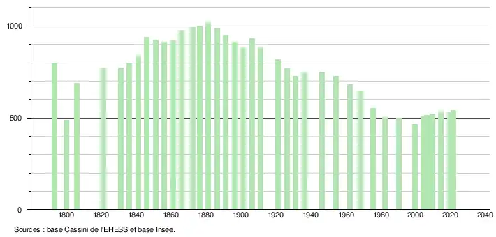 L'évolution du nombre d'habitants est connue à travers les recensements de la population effectués dans la commune depuis 1793. Pour les communes de moins de 10 000 habitants, une enquête de recensement portant sur toute la population est réalisée tous les cinq ans, les populations légales des années intermédiaires étant quant à elles estimées par interpolation ou extrapolation[18]. Pour la commune, le premier recensement exhaustif entrant dans le cadre du nouveau dispositif a été réalisé en 2004[19].