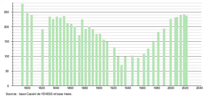 L'évolution du nombre d'habitants est connue à travers les recensements de la population effectués dans la commune depuis 1793. Pour les communes de moins de 10 000 habitants, une enquête de recensement portant sur toute la population est réalisée tous les cinq ans, les populations légales des années intermédiaires étant quant à elles estimées par interpolation ou extrapolation[30]. Pour la commune, le premier recensement exhaustif entrant dans le cadre du nouveau dispositif a été réalisé en 2008[31].