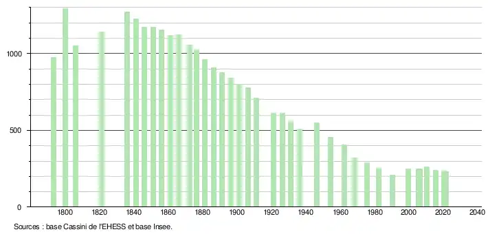 L'évolution du nombre d'habitants est connue à travers les recensements de la population effectués dans la commune depuis 1793. Pour les communes de moins de 10 000 habitants, une enquête de recensement portant sur toute la population est réalisée tous les cinq ans, les populations légales des années intermédiaires étant quant à elles estimées par interpolation ou extrapolation[19]. Pour la commune, le premier recensement exhaustif entrant dans le cadre du nouveau dispositif a été réalisé en 2005[20].