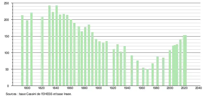 L'évolution du nombre d'habitants est connue à travers les recensements de la population effectués dans la commune depuis 1793. Pour les communes de moins de 10 000 habitants, une enquête de recensement portant sur toute la population est réalisée tous les cinq ans, les populations légales des années intermédiaires étant quant à elles estimées par interpolation ou extrapolation[15]. Pour la commune, le premier recensement exhaustif entrant dans le cadre du nouveau dispositif a été réalisé en 2004[16].