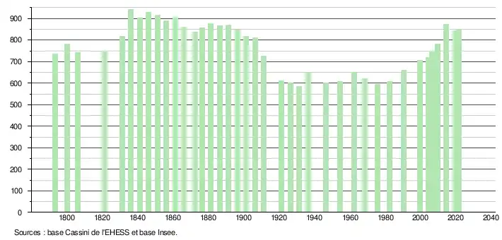 - Population municipale légale en vigueur au 1er janvier 2024, millésimée 2021, définie dans les limites territoriales en vigueur au 1er janvier 2023, date de référence statistique : 1er janvier 2021.