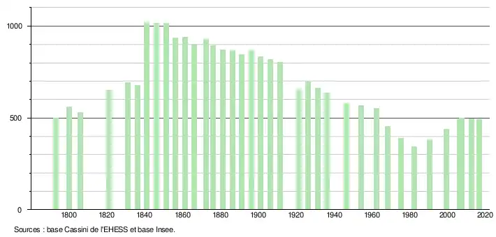 L'évolution du nombre d'habitants est connue à travers les recensements de la population effectués dans la commune depuis 1793. Pour les communes de moins de 10 000 habitants, une enquête de recensement portant sur toute la population est réalisée tous les cinq ans, les populations légales des années intermédiaires étant quant à elles estimées par interpolation ou extrapolation[4]. Pour la commune, le premier recensement exhaustif entrant dans le cadre du nouveau dispositif a été réalisé en 2007[5].
