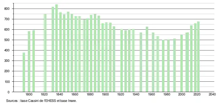 L'évolution du nombre d'habitants est connue à travers les recensements de la population effectués dans la commune depuis 1793. Pour les communes de moins de 10 000 habitants, une enquête de recensement portant sur toute la population est réalisée tous les cinq ans, les populations légales des années intermédiaires étant quant à elles estimées par interpolation ou extrapolation[14]. Pour la commune, le premier recensement exhaustif entrant dans le cadre du nouveau dispositif a été réalisé en 2007[15].