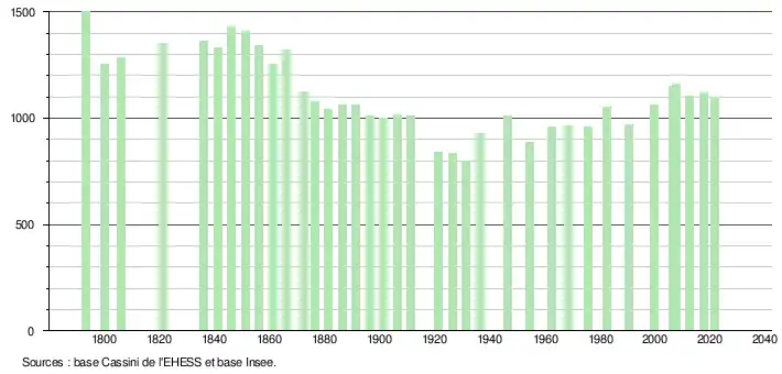 L'évolution du nombre d'habitants est connue à travers les recensements de la population effectués dans la commune depuis 1793. Pour les communes de moins de 10 000 habitants, une enquête de recensement portant sur toute la population est réalisée tous les cinq ans, les populations légales des années intermédiaires étant quant à elles estimées par interpolation ou extrapolation[18]. Pour la commune, le premier recensement exhaustif entrant dans le cadre du nouveau dispositif a été réalisé en 2007[19].