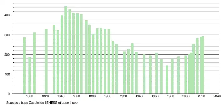 L'évolution du nombre d'habitants est connue à travers les recensements de la population effectués dans la commune depuis 1793. Pour les communes de moins de 10 000 habitants, une enquête de recensement portant sur toute la population est réalisée tous les cinq ans, les populations légales des années intermédiaires étant quant à elles estimées par interpolation ou extrapolation[18]. Pour la commune, le premier recensement exhaustif entrant dans le cadre du nouveau dispositif a été réalisé en 2004[19].