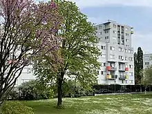 Dessinée en 1968, par l’architecte André Lurçat, la cité des Cosmonautes est un quartier de 5 hectares situé à la frange est de Saint-Denis[34], enclavé par le voisinage de l'autoroute A1 et en lisière de la limite communale avec La Courneuve (résidence du Parc et lieu-dit du Moulin-Fayvon).