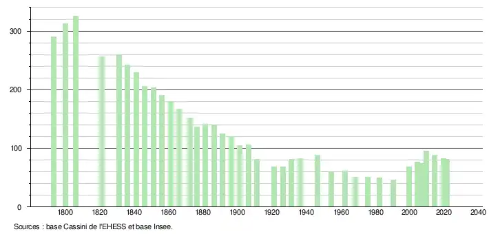 L'évolution du nombre d'habitants est connue à travers les recensements de la population effectués dans la commune depuis 1793. Pour les communes de moins de 10 000 habitants, une enquête de recensement portant sur toute la population est réalisée tous les cinq ans, les populations légales des années intermédiaires étant quant à elles estimées par interpolation ou extrapolation[18]. Pour la commune, le premier recensement exhaustif entrant dans le cadre du nouveau dispositif a été réalisé en 2004[19].