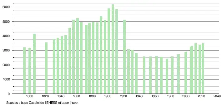 L'évolution du nombre d'habitants est connue à travers les recensements de la population effectués dans la commune depuis 1793. Pour les communes de moins de 10 000 habitants, une enquête de recensement portant sur toute la population est réalisée tous les cinq ans, les populations légales des années intermédiaires étant quant à elles estimées par interpolation ou extrapolation[37]. Pour la commune, le premier recensement exhaustif entrant dans le cadre du nouveau dispositif a été réalisé en 2007[38].