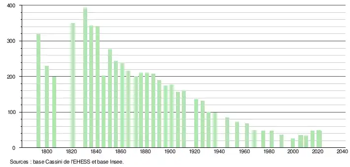 L'évolution du nombre d'habitants est connue à travers les recensements de la population effectués dans la commune depuis 1793. Pour les communes de moins de 10 000 habitants, une enquête de recensement portant sur toute la population est réalisée tous les cinq ans, les populations légales des années intermédiaires étant quant à elles estimées par interpolation ou extrapolation[18]. Pour la commune, le premier recensement exhaustif entrant dans le cadre du nouveau dispositif a été réalisé en 2005[19].