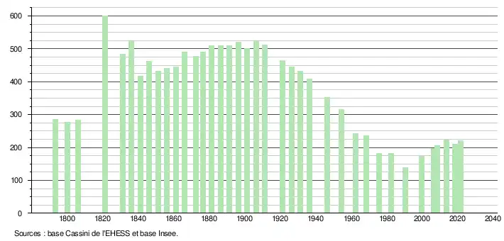 L'évolution du nombre d'habitants est connue à travers les recensements de la population effectués dans la commune depuis 1793. Pour les communes de moins de 10 000 habitants, une enquête de recensement portant sur toute la population est réalisée tous les cinq ans, les populations légales des années intermédiaires étant quant à elles estimées par interpolation ou extrapolation[30]. Pour la commune, le premier recensement exhaustif entrant dans le cadre du nouveau dispositif a été réalisé en 2008[31].