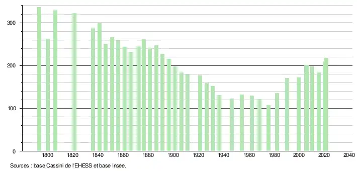 L'évolution du nombre d'habitants est connue à travers les recensements de la population effectués dans la commune depuis 1793. Pour les communes de moins de 10 000 habitants, une enquête de recensement portant sur toute la population est réalisée tous les cinq ans, les populations légales des années intermédiaires étant quant à elles estimées par interpolation ou extrapolation[14]. Pour la commune, le premier recensement exhaustif entrant dans le cadre du nouveau dispositif a été réalisé en 2005[15].