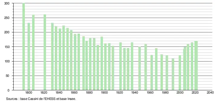 L'évolution du nombre d'habitants est connue à travers les recensements de la population effectués dans la commune depuis 1793. Pour les communes de moins de 10 000 habitants, une enquête de recensement portant sur toute la population est réalisée tous les cinq ans, les populations légales des années intermédiaires étant quant à elles estimées par interpolation ou extrapolation[22]. Pour la commune, le premier recensement exhaustif entrant dans le cadre du nouveau dispositif a été réalisé en 2005[23].