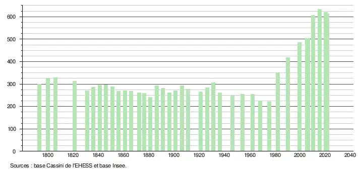 L'évolution du nombre d'habitants est connue à travers les recensements de la population effectués dans la commune depuis 1793. Pour les communes de moins de 10 000 habitants, une enquête de recensement portant sur toute la population est réalisée tous les cinq ans, les populations légales des années intermédiaires étant quant à elles estimées par interpolation ou extrapolation[38]. Pour la commune, le premier recensement exhaustif entrant dans le cadre du nouveau dispositif a été réalisé en 2005[39].