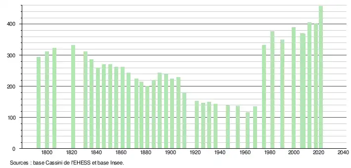 L'évolution du nombre d'habitants est connue à travers les recensements de la population effectués dans la commune depuis 1793. Pour les communes de moins de 10 000 habitants, une enquête de recensement portant sur toute la population est réalisée tous les cinq ans, les populations légales des années intermédiaires étant quant à elles estimées par interpolation ou extrapolation[42]. Pour la commune, le premier recensement exhaustif entrant dans le cadre du nouveau dispositif a été réalisé en 2007[43].