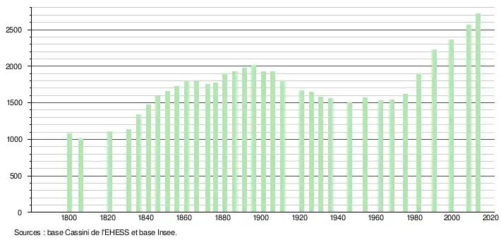 L'évolution du nombre d'habitants est connue à travers les recensements de la population effectués dans la commune depuis 1800. À partir du , les populations légales des communes sont publiées annuellement dans le cadre d'un recensement qui repose désormais sur une collecte d'information annuelle, concernant successivement tous les territoires communaux au cours d'une période de cinq ans. Pour les communes de moins de 10 000 habitants, une enquête de recensement portant sur toute la population est réalisée tous les cinq ans, les populations légales des années intermédiaires étant quant à elles estimées par interpolation ou extrapolation[10]. Pour la commune, le premier recensement exhaustif entrant dans le cadre du nouveau dispositif a été réalisé en 2008[11],[Note 3].