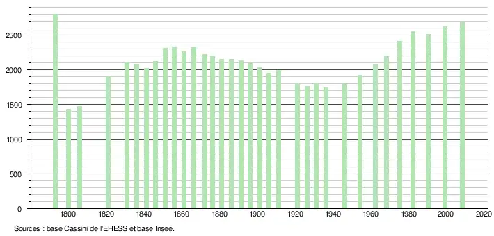 - Par convention dans Wikipédia, le principe a été retenu de n’afficher dans le tableau des recensements et le graphique, pour les populations légales postérieures à 1999, que les populations correspondant à une enquête exhaustive de recensement pour les communes de moins de 10 000 habitants, et que les populations des années 2006, 2011, 2016, etc. pour les communes de plus de 10 000 habitants, ainsi que la dernière population légale publiée par l’Insee pour l'ensemble des communes.