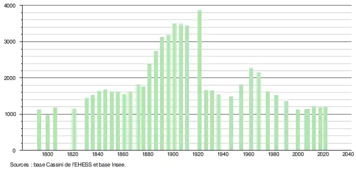 L'évolution du nombre d'habitants est connue à travers les recensements de la population effectués dans la commune depuis 1793. Pour les communes de moins de 10 000 habitants, une enquête de recensement portant sur toute la population est réalisée tous les cinq ans, les populations légales des années intermédiaires étant quant à elles estimées par interpolation ou extrapolation[26]. Pour la commune, le premier recensement exhaustif entrant dans le cadre du nouveau dispositif a été réalisé en 2007[27].