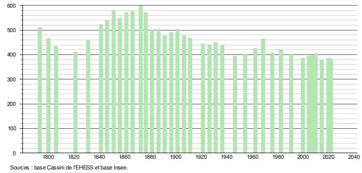 L'évolution du nombre d'habitants est connue à travers les recensements de la population effectués dans la commune depuis 1793. Pour les communes de moins de 10 000 habitants, une enquête de recensement portant sur toute la population est réalisée tous les cinq ans, les populations légales des années intermédiaires étant quant à elles estimées par interpolation ou extrapolation[34]. Pour la commune, le premier recensement exhaustif entrant dans le cadre du nouveau dispositif a été réalisé en 2004[35].