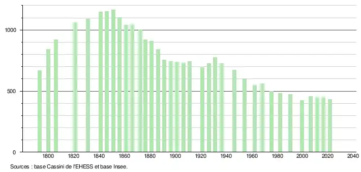 L'évolution du nombre d'habitants est connue à travers les recensements de la population effectués dans la commune depuis 1793. Pour les communes de moins de 10 000 habitants, une enquête de recensement portant sur toute la population est réalisée tous les cinq ans, les populations légales des années intermédiaires étant quant à elles estimées par interpolation ou extrapolation[37]. Pour la commune, le premier recensement exhaustif entrant dans le cadre du nouveau dispositif a été réalisé en 2006[38].