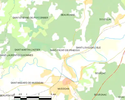 L'Isle en limite de Mussidan à gauche et Saint-Front-de-Pradoux, en rive opposée. L'Isle en limite de Mussidan à gauche et Saint-Front-de-Pradoux, en rive opposée.