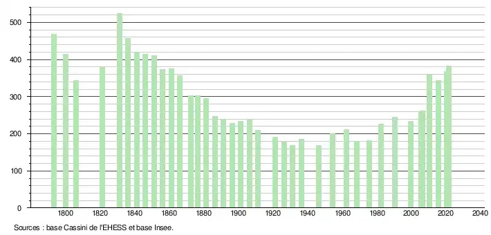 L'évolution du nombre d'habitants est connue à travers les recensements de la population effectués dans la commune depuis 1793. Pour les communes de moins de 10 000 habitants, une enquête de recensement portant sur toute la population est réalisée tous les cinq ans, les populations légales des années intermédiaires étant quant à elles estimées par interpolation ou extrapolation[23]. Pour la commune, le premier recensement exhaustif entrant dans le cadre du nouveau dispositif a été réalisé en 2005[24].