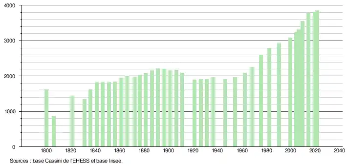 L'évolution du nombre d'habitants est connue à travers les recensements de la population effectués dans la commune depuis 1800. Pour les communes de moins de 10 000 habitants, une enquête de recensement portant sur toute la population est réalisée tous les cinq ans, les populations légales des années intermédiaires étant quant à elles estimées par interpolation ou extrapolation[23]. Pour la commune, le premier recensement exhaustif entrant dans le cadre du nouveau dispositif a été réalisé en 2004[24].