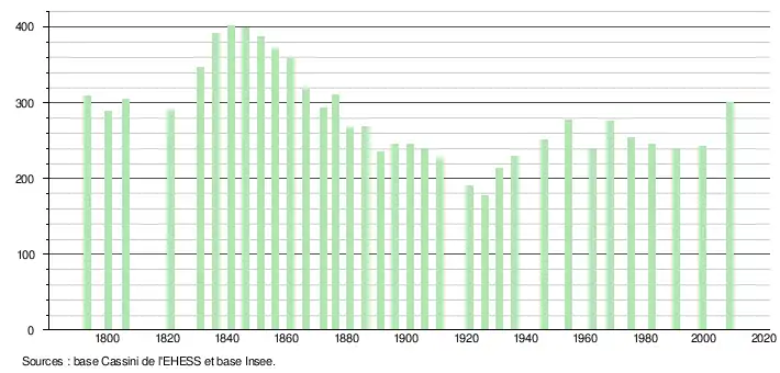 L'évolution du nombre d'habitants est connue à travers les recensements de la population effectués dans la commune depuis 1793. À partir du , les populations légales des communes sont publiées annuellement dans le cadre d'un recensement qui repose désormais sur une collecte d'information annuelle, concernant successivement tous les territoires communaux au cours d'une période de cinq ans. Pour les communes de moins de 10 000 habitants, une enquête de recensement portant sur toute la population est réalisée tous les cinq ans, les populations légales des années intermédiaires étant quant à elles estimées par interpolation ou extrapolation[8]. Pour la commune, le premier recensement exhaustif entrant dans le cadre du nouveau dispositif a été réalisé en 2008[9],[Note 1].