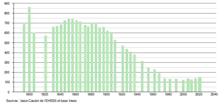 L'évolution du nombre d'habitants est connue à travers les recensements de la population effectués dans la commune depuis 1793. Pour les communes de moins de 10 000 habitants, une enquête de recensement portant sur toute la population est réalisée tous les cinq ans, les populations légales des années intermédiaires étant quant à elles estimées par interpolation ou extrapolation[28]. Pour la commune, le premier recensement exhaustif entrant dans le cadre du nouveau dispositif a été réalisé en 2005[29].